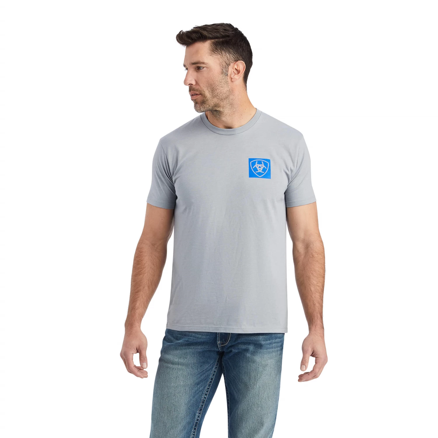 - Blue ariat shield logo on upper left chest.