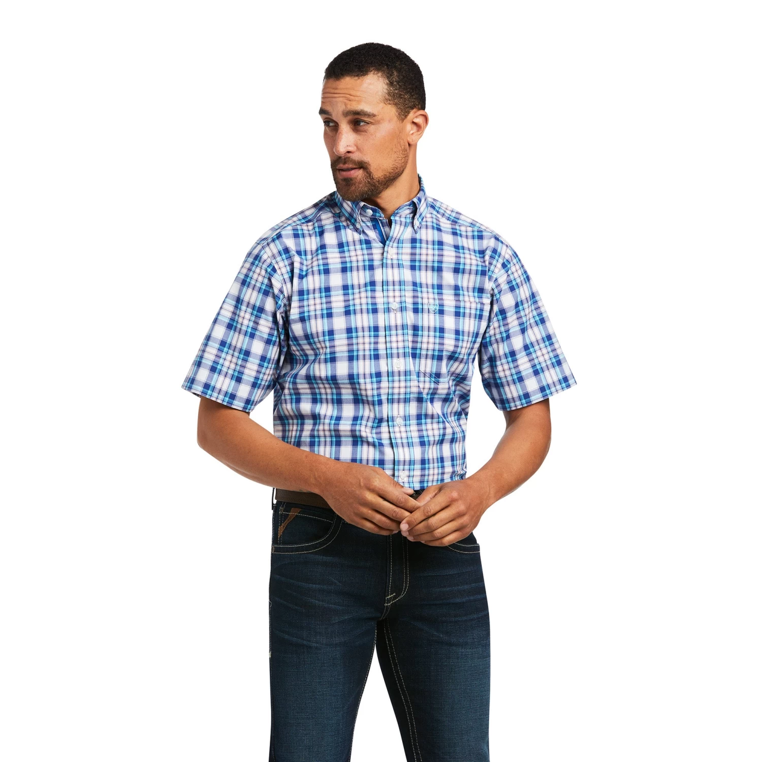 - Ariat® blue plaid button down short sleeve shirt