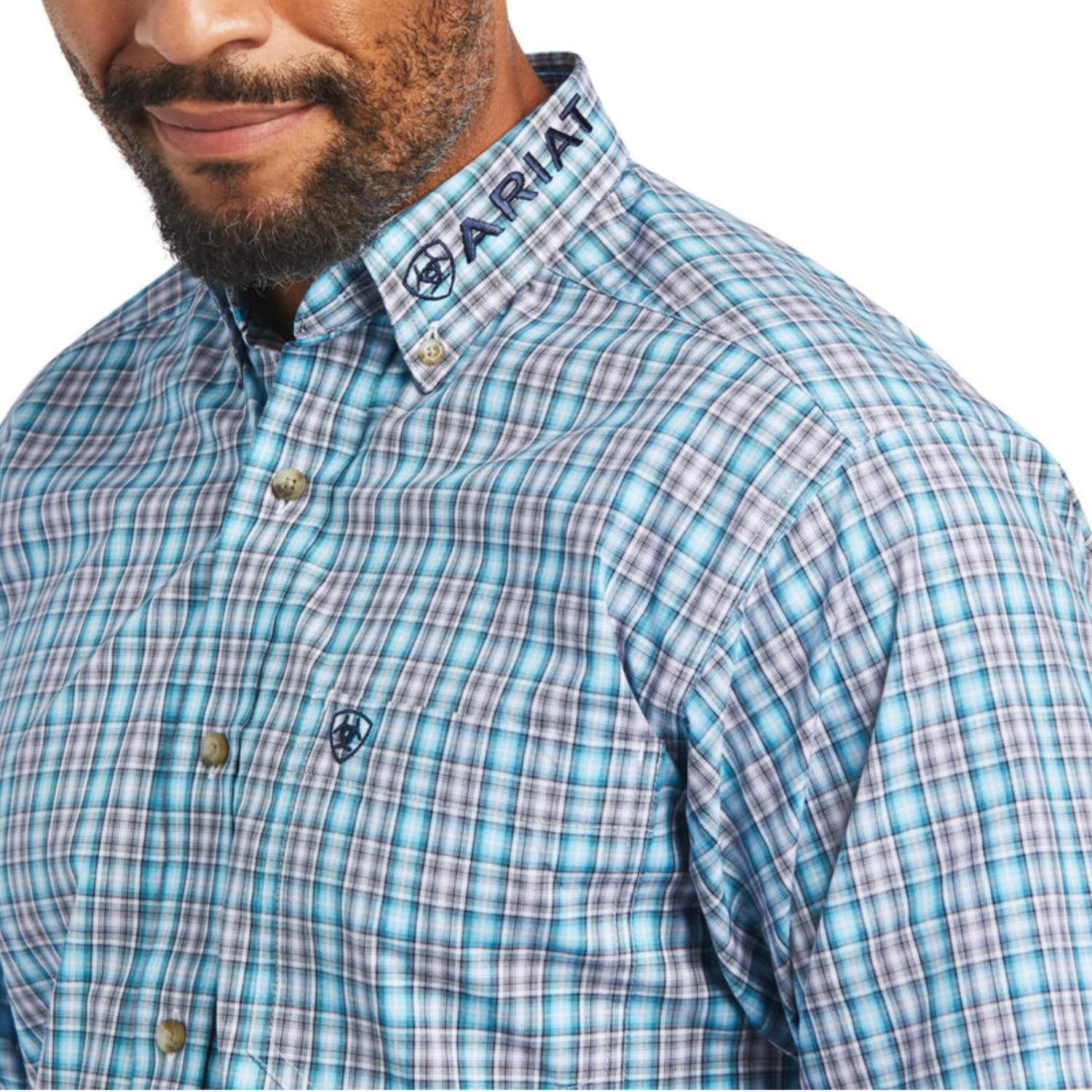 - Navy embroidered ariat logo down arm & across collar.